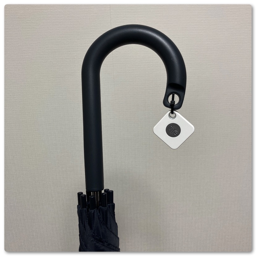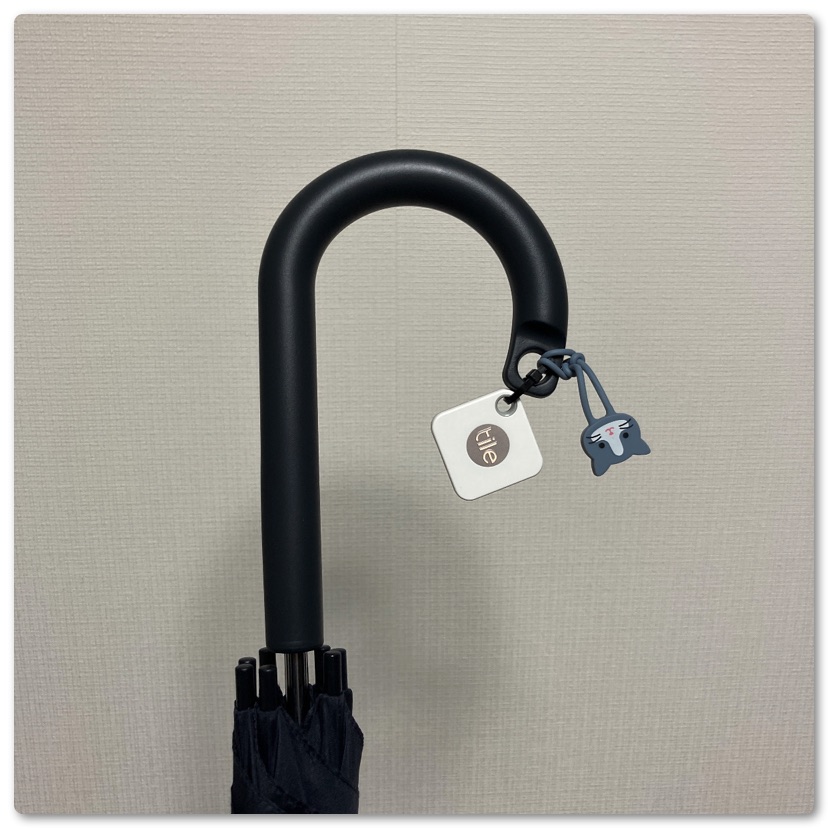 無印良品の傘は持ち手の先に穴が空いており、ここにナイロンバンドを通してTileを結束しました。無印良品の商品はこういうアイデアが光ります。