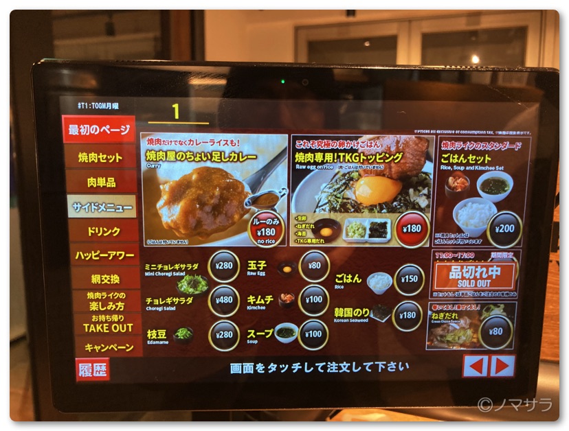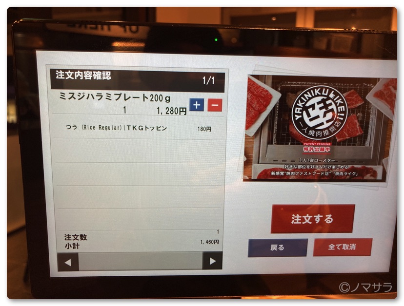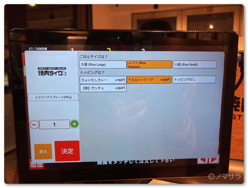 席は一人ずつ区切られているため複数人での食事には向きません。間違ってもデートで行かないように…(笑)カウンターには液晶タッチパネルの画面がありセルフで注文します。紙のメニューはなく全てデジタルメニューになります。