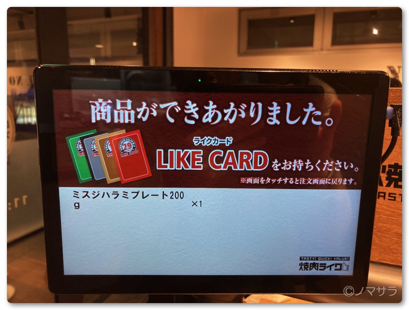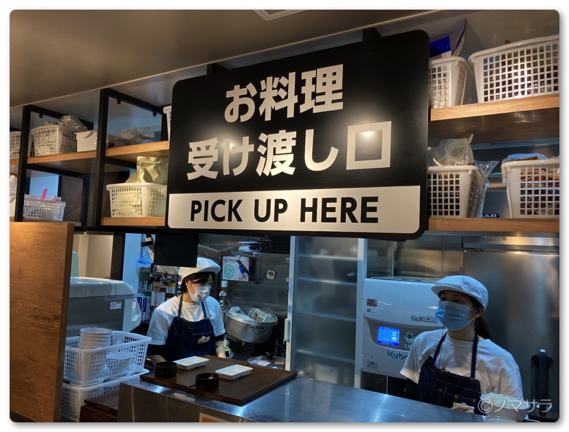 オーダーしてしばらくすると「商品ができあがりました」と案内が表示されるので番号札を持って自分で料理を取りにに行きます。