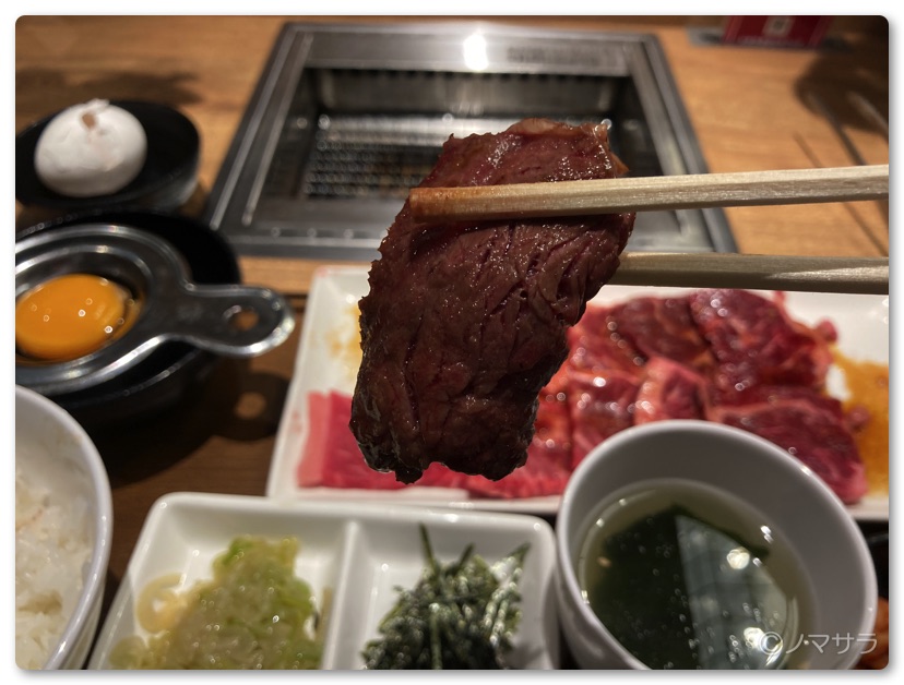 今回は初めての訪問だったので事前に調べておいた「ミスジとハラミのプレート200g」と「卵かけご飯」を注文。