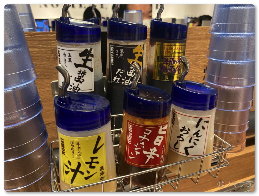 焼き肉のタレはあっさり生醤油、濃厚生醤油、つけてみそかけてみそ、レモン汁、旨辛コチュジャン、にんにくおろしの6種類ですがお肉にしっかりタレが絡んでいるので全く使うことなく美味しくいただきました。牛タンを頼んだらレモン汁は使ってもいいかと思います。にんにくおろしは翌日に響くので休みのとき以外は使えません。