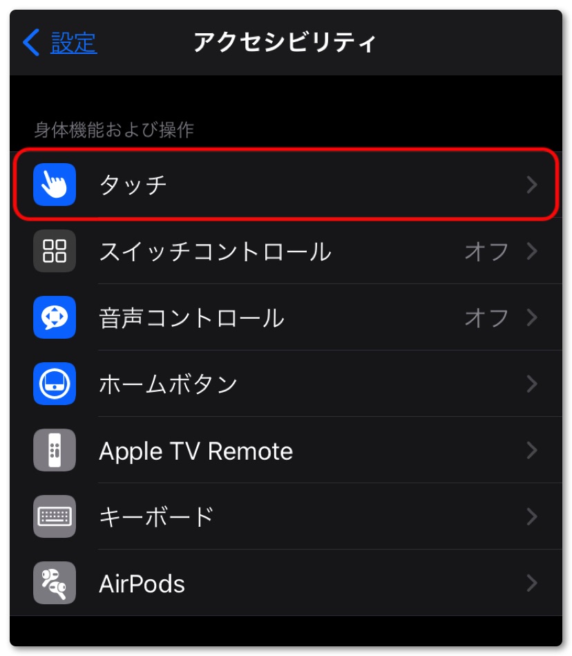 歯車マークの設定アイコンをタップしアクセシビリティをタップし中程にある「タッチ」をタップ。