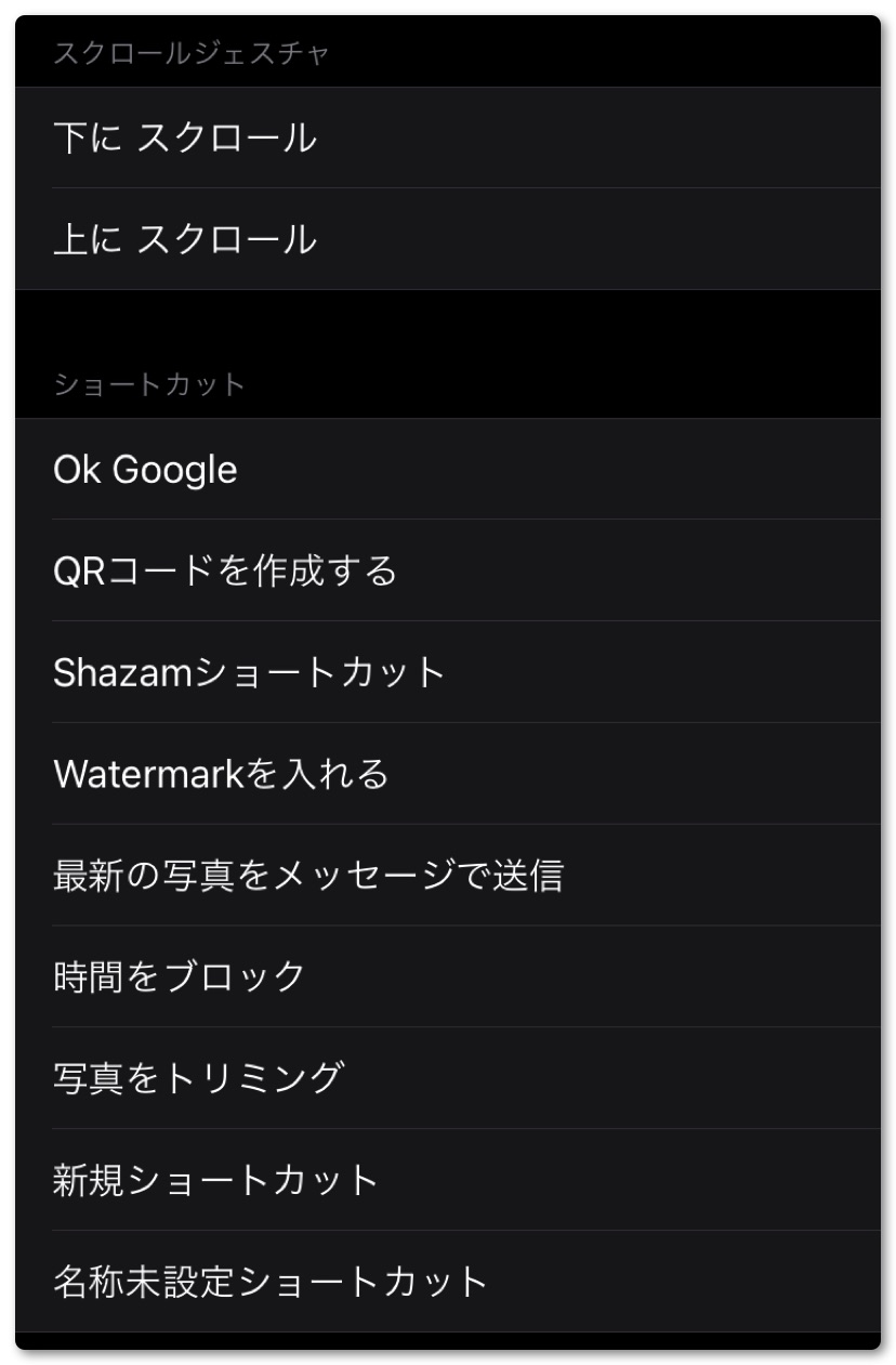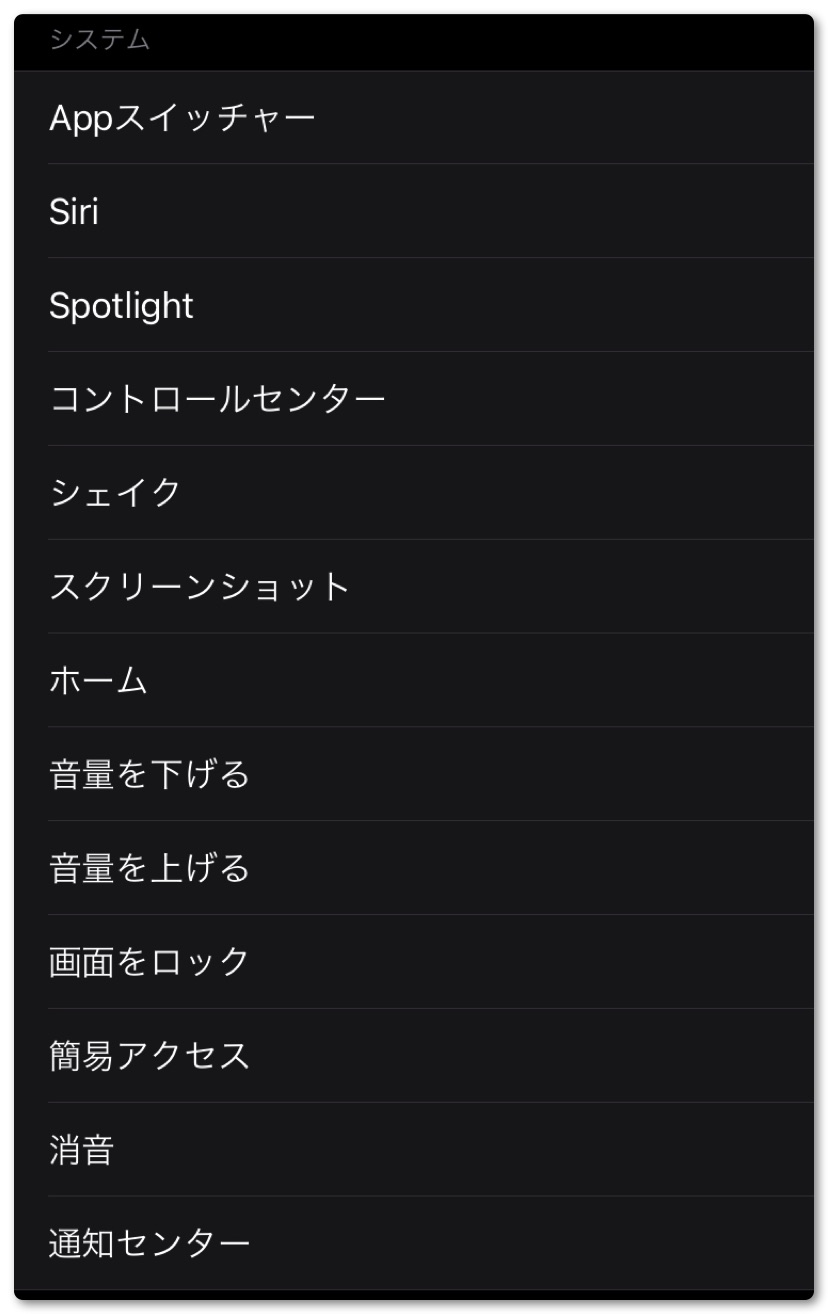 選択できる項目は「システム」「アクセシビリティ」「スクロールゼスチャ」「ショートカット」があり、それぞれに複数の項目があります。自分でよく使いそうな操作を選んでみてください。