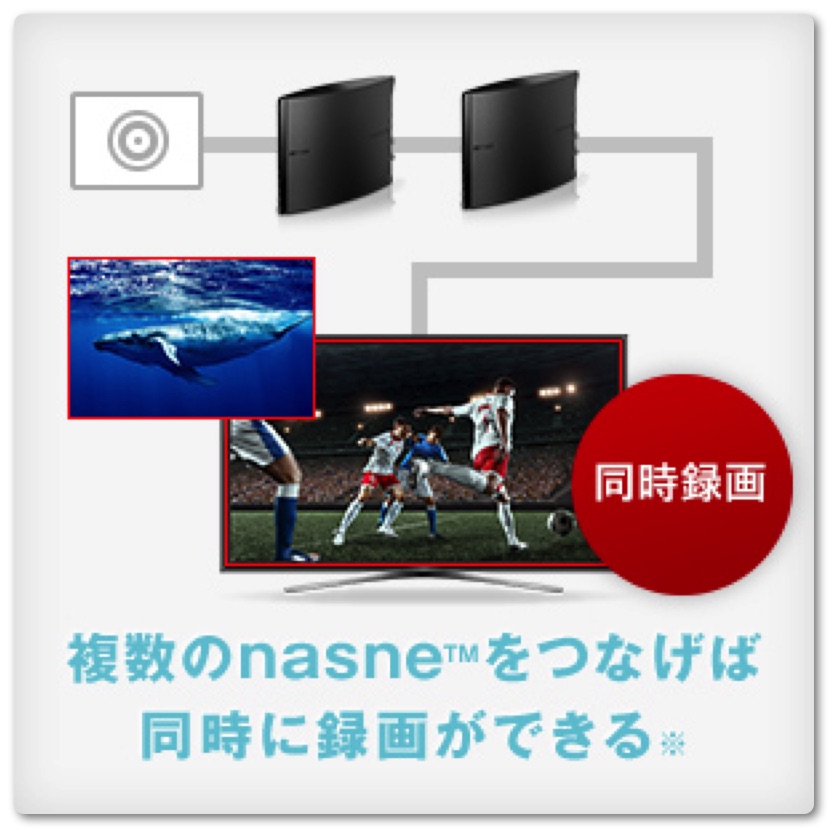 また複数のnasneをつないで同時録画できるようになりました。バッファロー製「nasne」、SIE製 nasneをつなげば複数の番組を同時に視聴・録画できるようになります。家族と見たい番組が重なっても大丈夫ですが、今のところ、BDレコーダーとTVのレコーディング機能があるためこの機能を使うことはないような気がしています。もし、テレビやレコーダーがない方は複数繋いで利用するのはいいかもしれません。スマホやタブレット、パソコンを使って個室や寝室など好きな場所で楽しめるようになります。