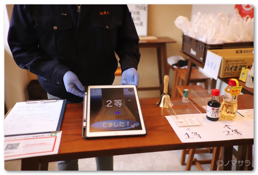 さらに500円で1回引ける抽選会を開催中。何が当たるかは行ってからのお楽しみということで。写真を撮った時はちょうど2等が当っていました。ワタクシはくじでは運を使わないタイプなので5等と参加賞、それぞれタオルとティッシュをいただいてきました(笑)