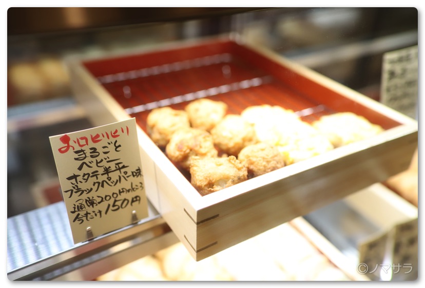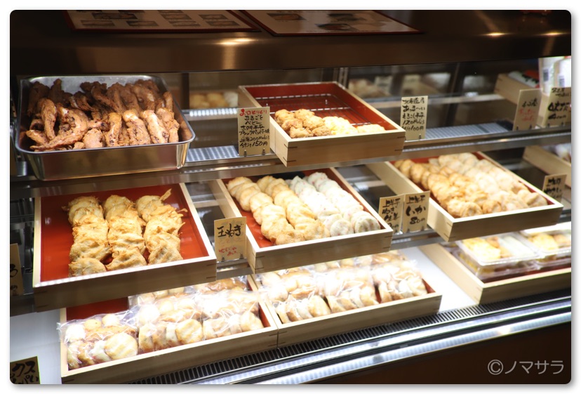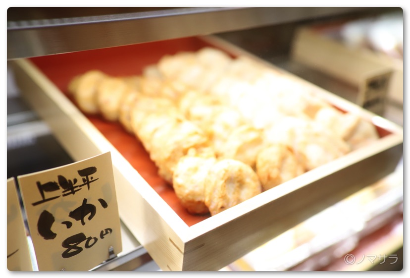 店内に入ると冷蔵ケースがあり、はんぺいなどが並んでいます。どれも美味しそう。ゲソ天にも惹かれましたが今回はおでんがメインなので見送ることにしました。