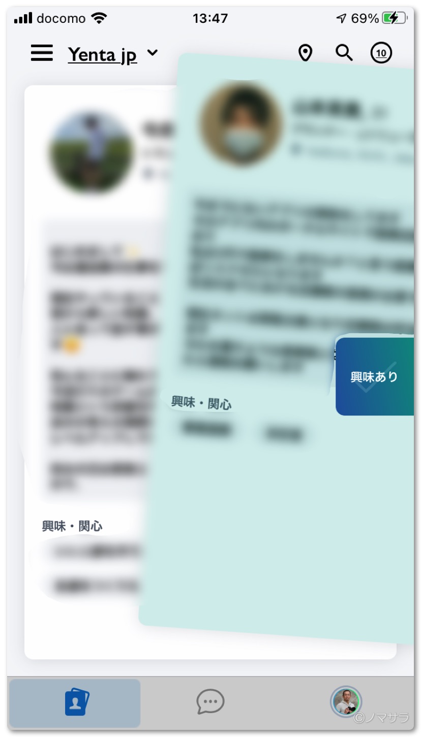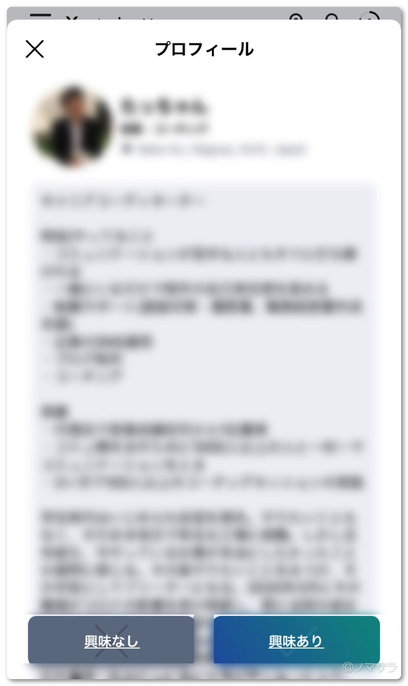 気になった方はプロフィールの詳細を見てから「興味あり」「興味なし」のボタンをタップして選ぶこともできます。