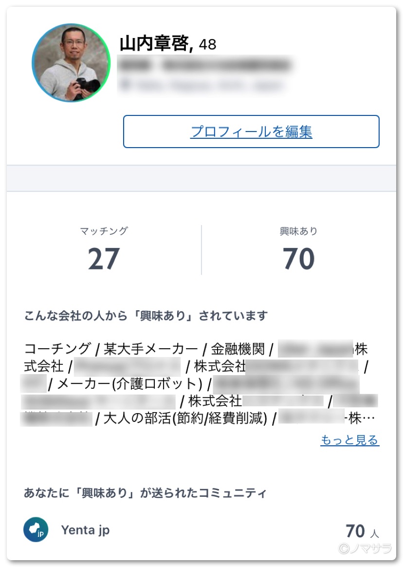 Yentaを使い始めて10日ほど経ちました。現在、27名の方とマッチングして70名の方から興味ありをいただいております。すでに5名の方とZoomで会ってお話しました。ビジネスを中心とした人的ネットワークを広げたい方はぜひ「Yenta」を使ってみてください。独身の方は意外と婚活に繋がるしれませんよ〜。