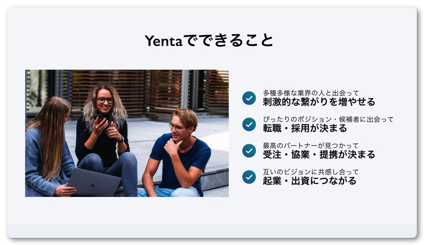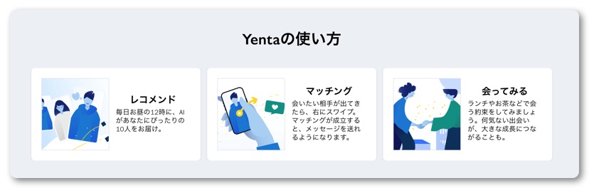 それを解決できるマッチングサービスが今回紹介する「Yenta」になります。この「Yenta」は先述の「ライフピボット」で著者の黒田さんが実際に使ってとてもいいと言うことで紹介されており、早速登録して使ってみることにしました。