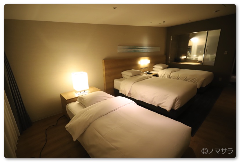 今回は温泉風呂付きのプレミアムツインキングルームにアップグレードしていただきました。ソファーベッドがあり妻のベッドに次女が添い寝し、長女はソファーベッドで寝たのでゆったり寝ることができました。ベッドはシモンズの高級ベッドが備え付けられています。ただし、枕がフニャフニャだったのでここは改善を望みます。