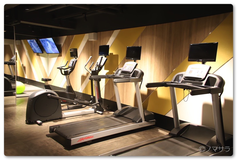 地下一階にはトレーニングルームがあります。セントレジスホテル大阪やリッツ・カールトン大阪に比べるとかなり小さめですがダンベルなどがあり最低限の筋トレはできます。