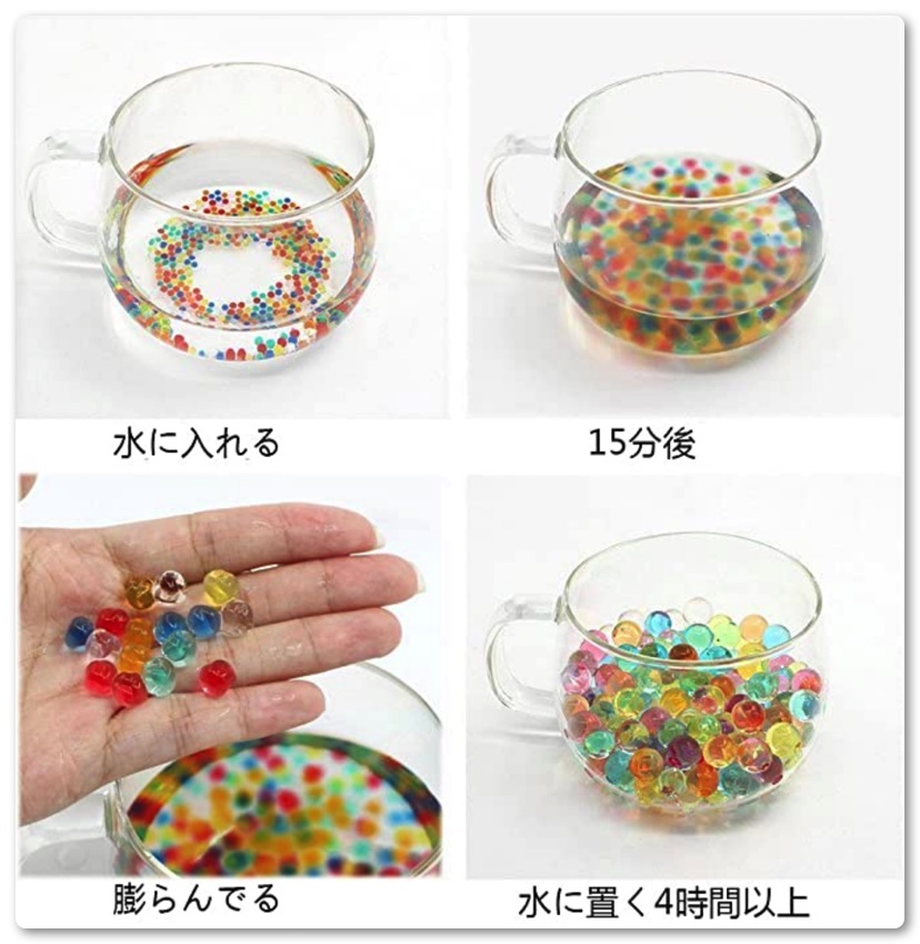乾燥した状態だと小さな硬いビーズ状なのですが水につけると一気に膨張してプニュプニュしたビー玉のような状態に変化します。