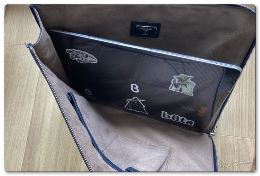 サイズは13インチのMacBookAirならピッタリ入ります。15インチはちょっと無理かも…。ファスナーはオリジナルで高級感があり◯KKのファスナーとは一線を画します。