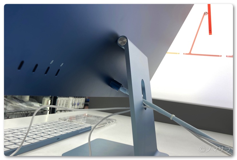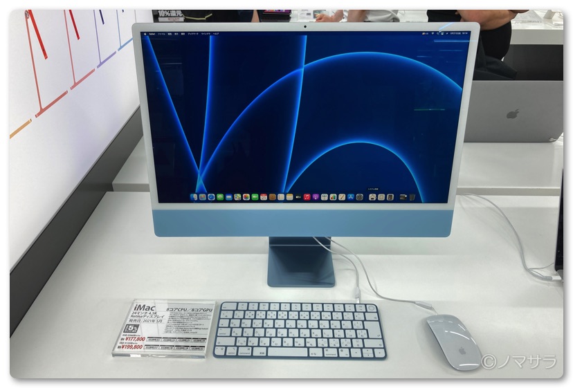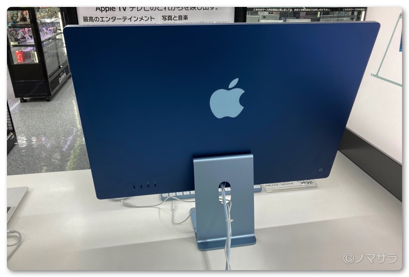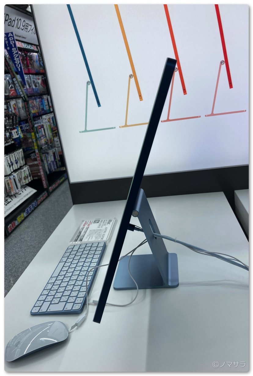 AppleStoreとは違い、置いてあったのはブルーだけでしたが色が違うだけなので特に問題はありません。今回のiMacはとにかく薄い!これも放熱がほぼ必要ないM1チップのおかげでしょう。重量も今までのiMacと比べて相当軽くなっています。