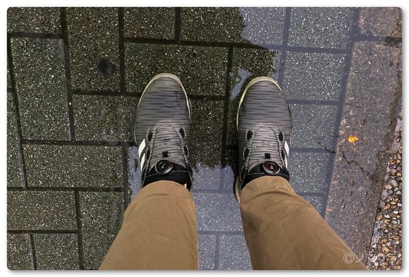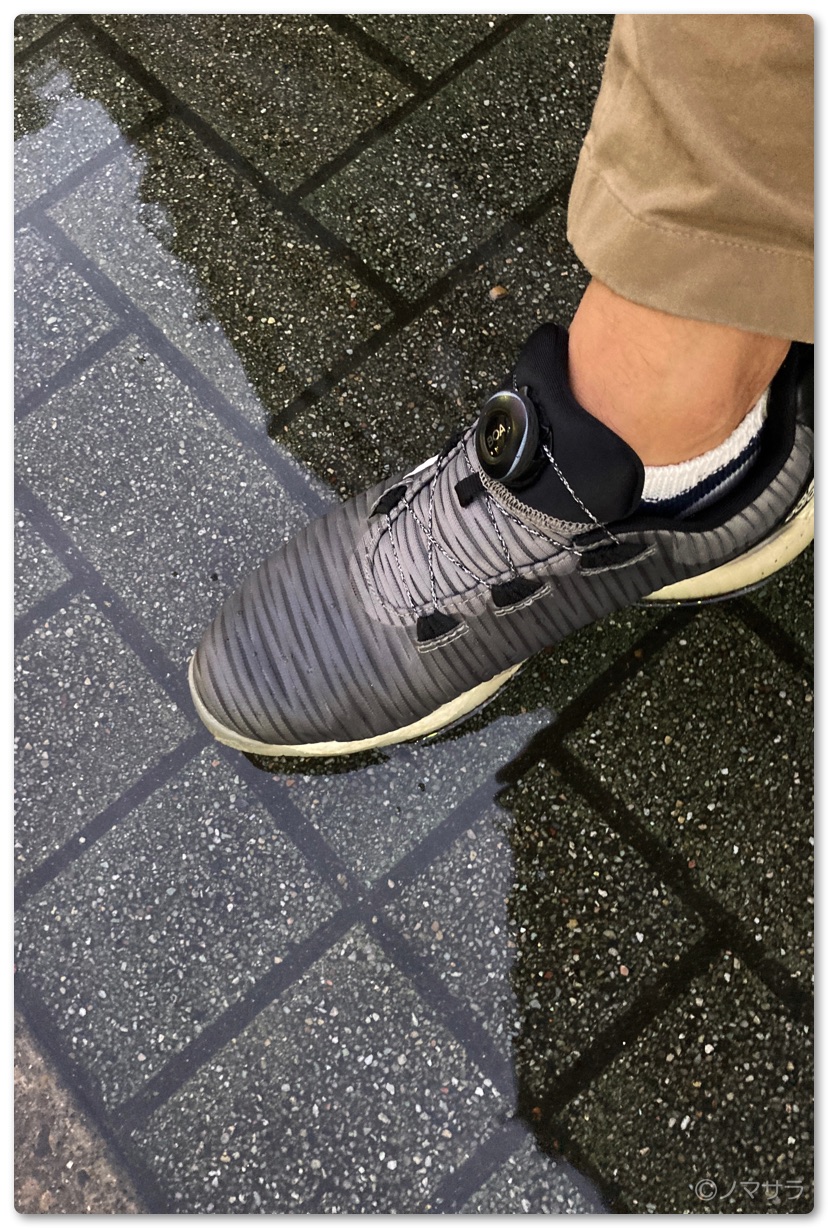 先日、警報が出るほどの豪雨の日に外へ出かけなければならず普通の靴ではすぐにビタビタになることが予想されたので「アディダス コードカオス」を履いて出かけることにしました。ゴルフ以外で履くのは初めてですが履き心地がいいので街中で履いていても違和感はありません。