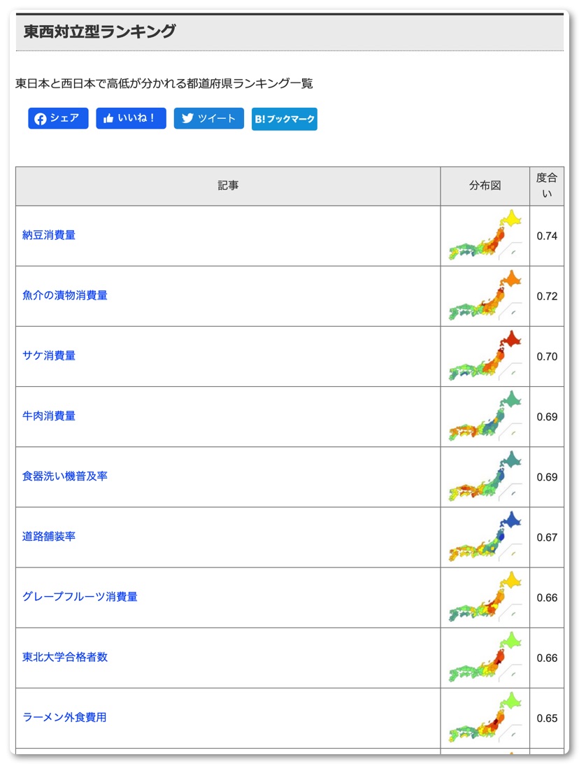 特に東西対立型ランキングは面白く、偏差の度合いが高いデータとしては「納豆消費量」「魚介の漬物消費量」「サケ消費量」「牛肉消費量」「食器洗い機普及率」などがあります。上位3つは想像通りでしたが、牛肉は圧倒的に西日本で消費されているということを初めて知りました。