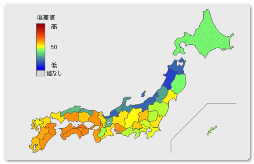 オンラインで何人か集まってデータ分布の日本地図を提示して「これは何のデータの分布図でしょう?」というクイズをしても楽しめるような気がします。持っている知識や想像力を駆使して何のデータ化を当てるのは脳トレになります。では試しに問題を出してみます。これは何のデータでしょうか?