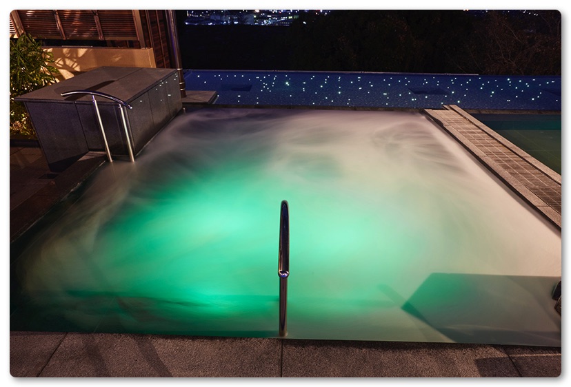 周囲には水盤が配置され、夜間は水中照明と間接照明だけを灯し、浴槽内ではLEDが7色に点滅され、幻想的な雰囲気を演出します。
