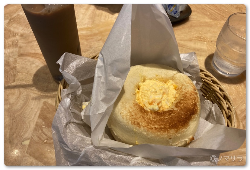 モーニングセットは430円で様々な種類のパンが選べます。二人ともいつも、リング型のほんのり甘くてやわらかいパンの中心にたまごサラダが入っているエッグリングとカフェオレを注文します。