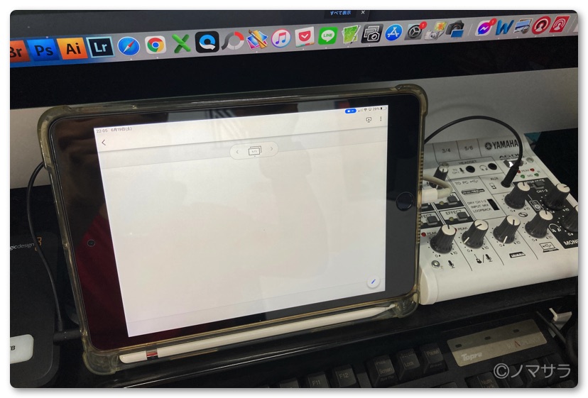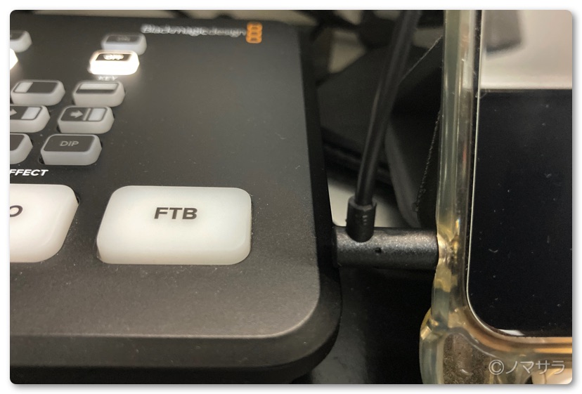 実際に「HDMIアダプタ接続」→「ATEM Miniで映像確認」→「イヤホンジャック挿し込み」でミキサーからiPad Miniの音声が流れました。いやはや、知識を持っている方々が集まっているサロンは本当に役に立ちありがたい限り。持っていたイヤホンジャックは真っ直ぐ挿すタイプで幅を取りATEM Miniに干渉するため、すぐにL字型のイヤホンジャックを購入し当たらないようにしました。これでiPad Miniで動画と音声を流すことが可能になりました。