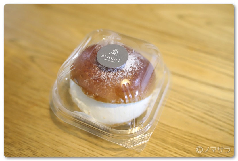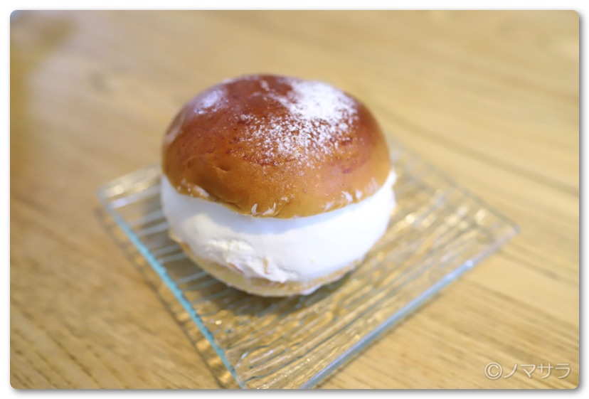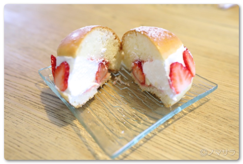 ブリオッシュパン生地の間にたっぷりの生クリームと少しのカスタードクリームが入っています。生クリームは甘さ控えめでサッパリしており、パン生地は甘くないので男性でもペロッと食べられると思います。ただし、結構ボリュームがあるので食後にデザートとして食べるなら2人で1個で十分ではないでしょうか。