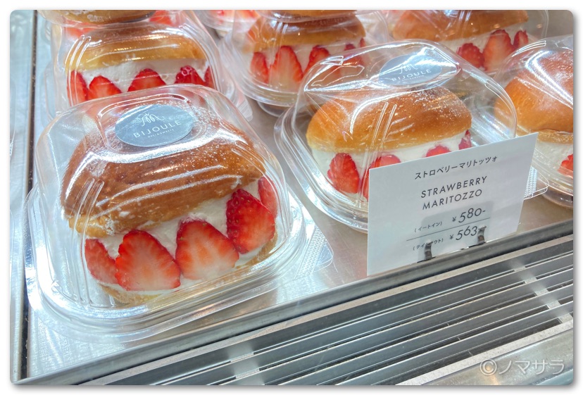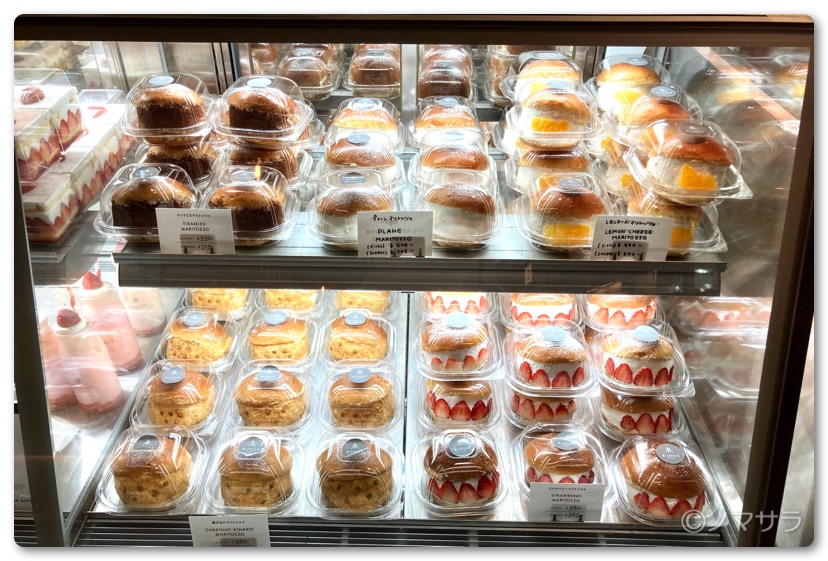 冷蔵ケースの中には5種類のマリトッツォが並んでいました。プレーン、ストロベリー、栗きなこ、ティラミス、レモンチーズとどれも美味しそう。妻に聞いたら「プレーンとストロベリー」とのことで2つ買って帰りました。