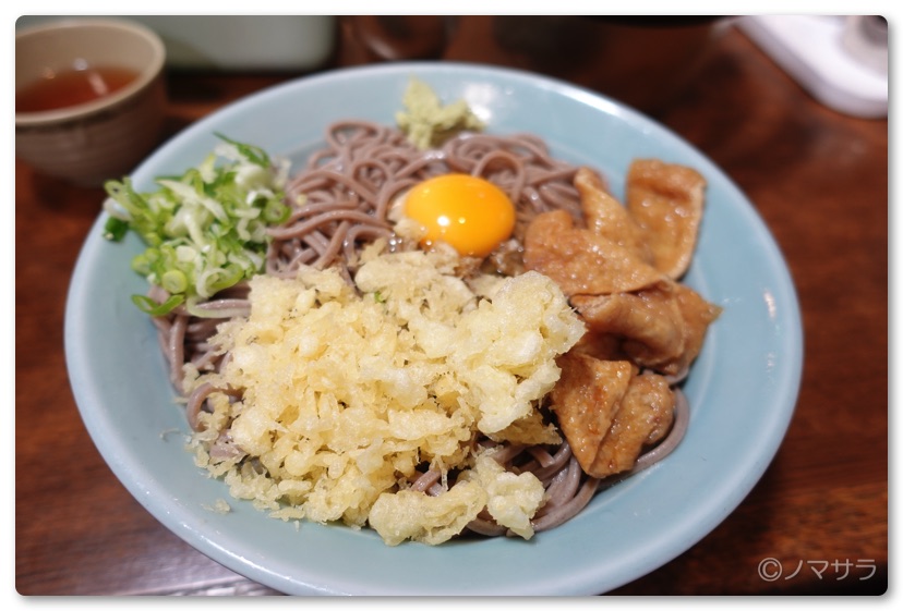 ここの名物は冷たい蕎麦にネギと揚げ玉、きつねあげが乗っている「冷やしたぬき」。ここを訪れた人の99%がこのメニューを注文します。さらにそのうちの7割ぐらいが「冷やしたぬきW(大盛り)」を注文します。今回もこれを頼みました。