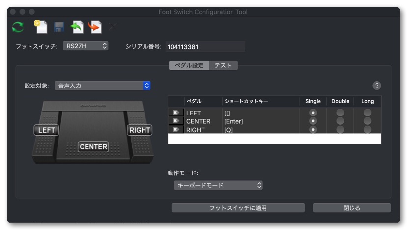 勝間さんはWindowsユーザーのため比較的安価な3,000円台のフット・スイッチを使っておられます。残念ながらこのフット・スイッチはMacには対応しておらず、色々調べたところMacで使えるのはオリンパスの「フットスイッチ RS27H」一択ということがわかりました。価格は約8,000円と2倍以上になります。