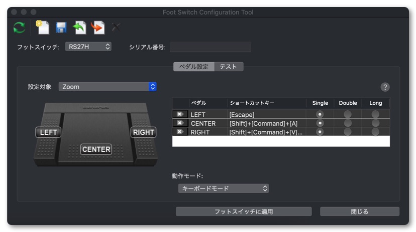 なお、キー設定はアプリケーションごとに設定できるので「音声入力」に加えて「Zoom」のキーを設定してみました。「全画面から戻る」、「ビデオのオンオフ」、「音声のミュート」の3つを登録してみました。このアプリケーションごとに切り替えができるのはめちゃくちゃ便利。今後も色々なアプリケーションごとに設定してみようと思います。
