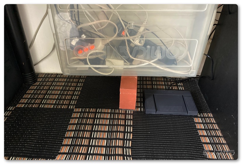場所は机の下の右足側へ。実際使うときは写真よりもう少し奥に置いています。