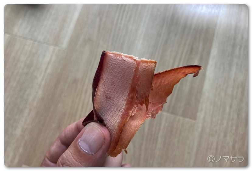 早速、そのまま一口食べてみました。確かに普通の削り節とは明らかに違ってソフトな食感で美味しいのですが、生ハムとは別物…。