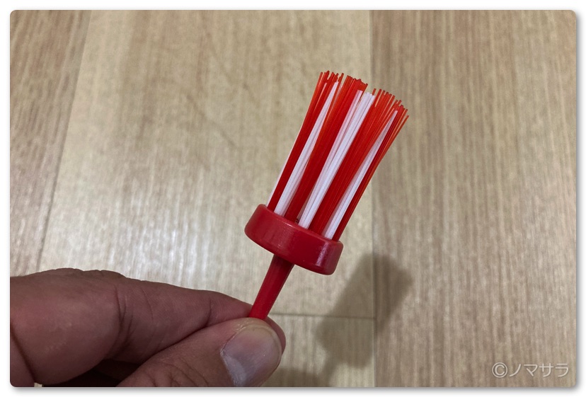 ボールを短いブラシ(白)で下から支え、長いブラシ(赤)で横からしっかりホールドします。