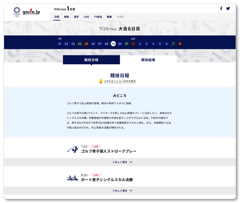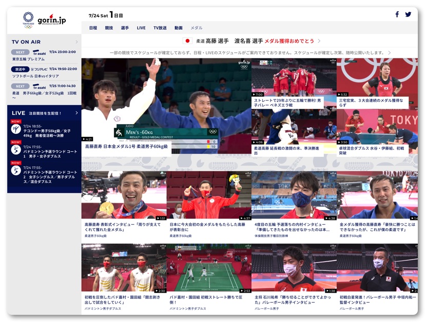 見逃してもハイライトや金メダルを獲得した競技についてはアーカイブがありますので大丈夫。