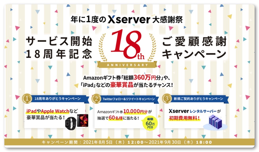 そのXserverがただいまサービス開始18周年記念として年に一度のご愛顧感謝キャンペーンを実施中。iPadやApplewatch、AirPodsPro、シャープのヘルシオホットクックなど豪華賞品が抽選で合計322名様に当たります。対象サービスをすでに契約中の方はもちろん、期間中に新たに契約した方も応募が可能となります。