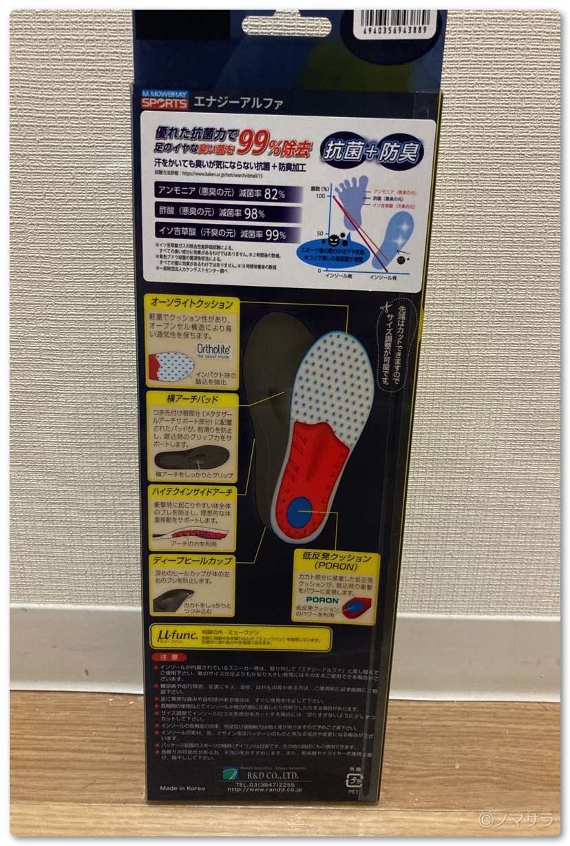 色々調べたり試したりした結果、値段が手頃で良さげだったのが今回購入した「エナジーアルファ」インソール。ゴルフのほか、野球、ボウリング、テニス、卓球、バドミントンなど様々な球技に最適な仕様となっています。