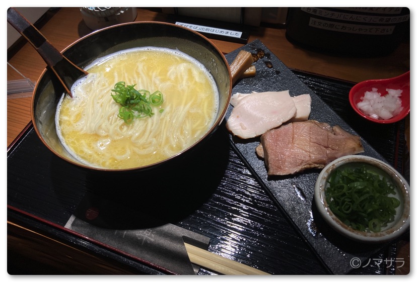メニューはどれも美味しそうで目移りしましたが、まずは定番の海老白湯と鶏白湯をそれぞれ注文。トッピングは別皿で提供されます。麺とスープの上に乗せてもいいし別に食べても構いません。