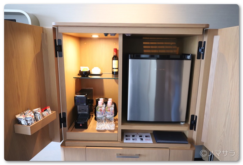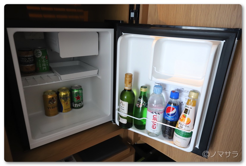 小型ではありますが小さな冷凍庫付き の冷蔵庫があり、ビールや炭酸水を持ち込んで冷やしておくことができます。