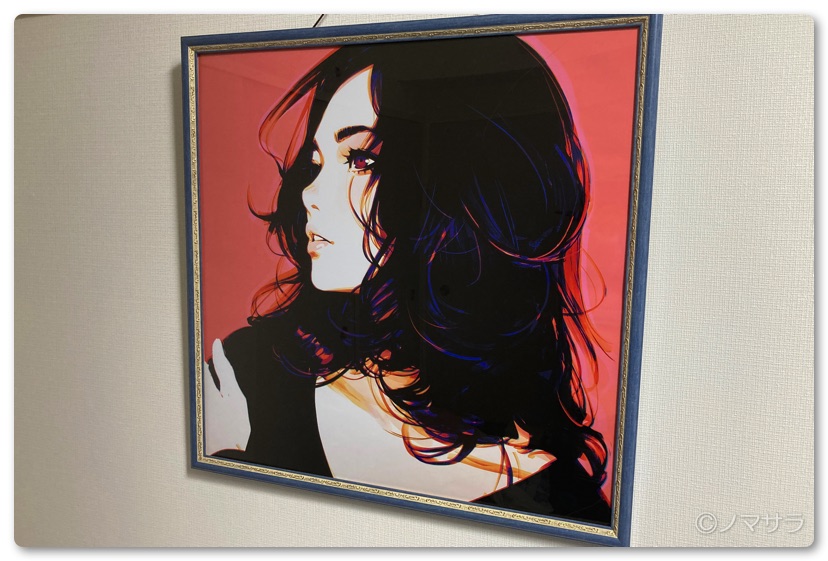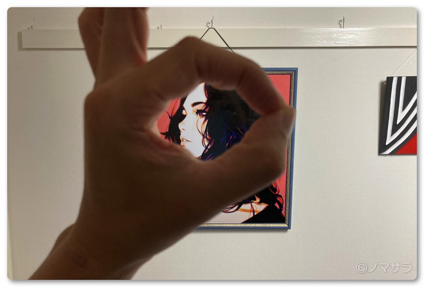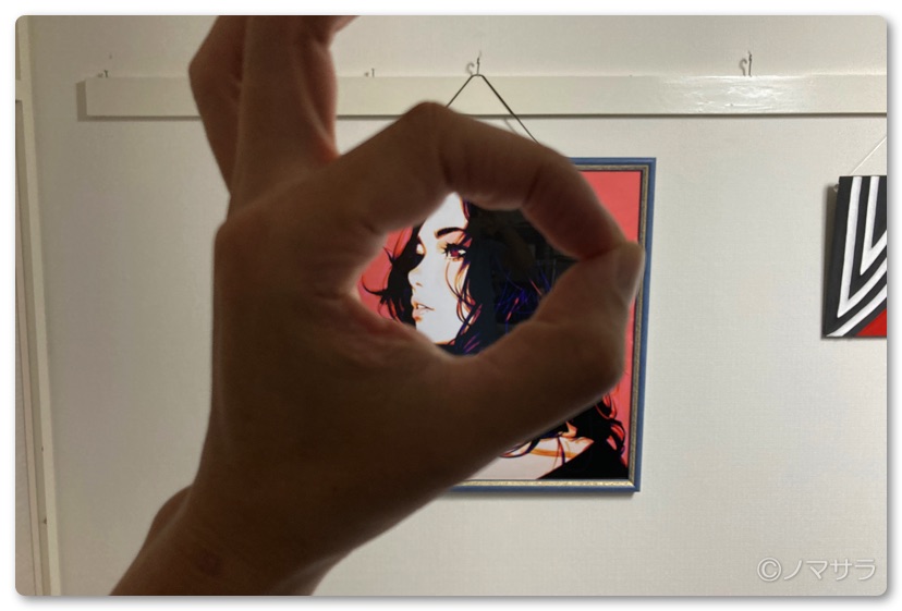 次に両目を開けたままその輪の中になにか対象として決めた物体が入るように輪っかを動かします。今回はお気に入りの絵の女性の顔を中央に入れます。