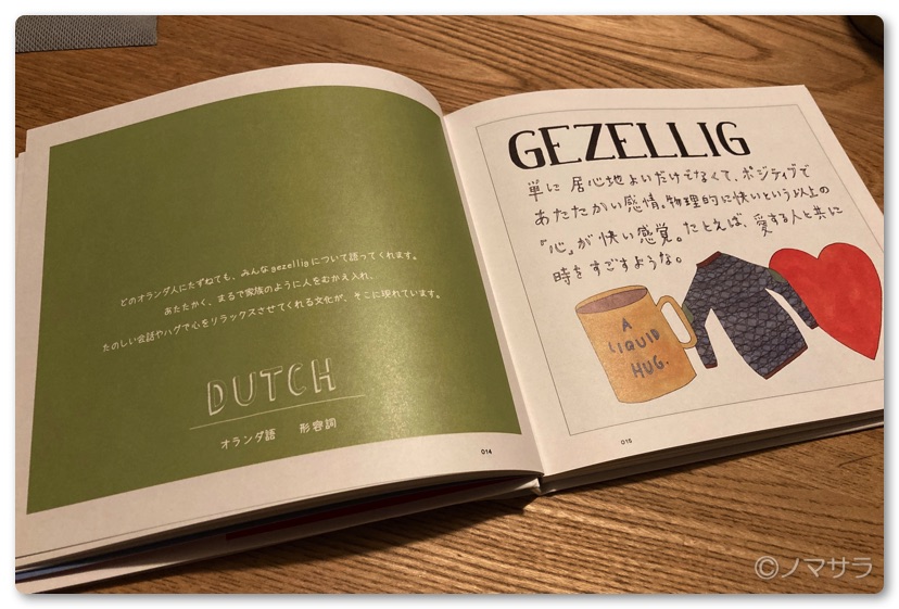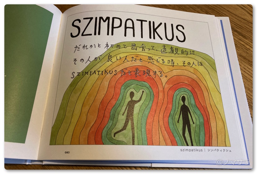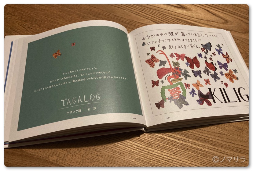 早速届いて目を通しました。見開きで2ページで、ポップな絵で「一つの言葉」が解説されています。文字数は少ないので30分もあれば読むことができます。ステキなイラストともに他の言語に訳すときに一言で言い表せないような各国固有の言葉が綴られています。
