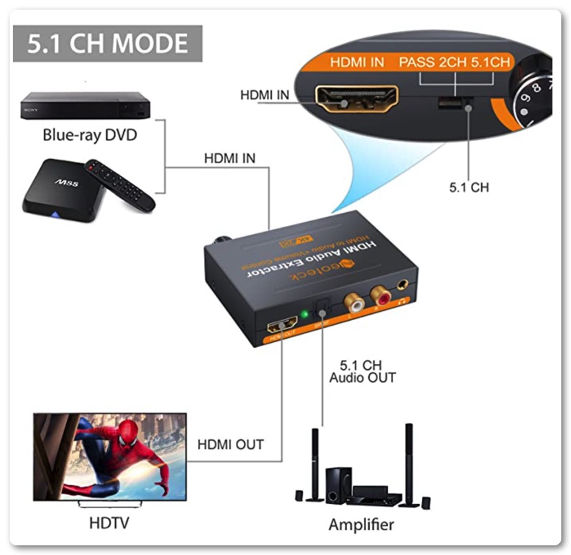 さて、本題ですが、Atem Miniに接続したiPadやMacbookAirで動画などを流した場合、映像は見えますが音声は流れず…。AtemMiniには音声データが入っているのですが、そのままではミキサーに出力することができません。そこで登場するのが今回紹介する「Neoteck HDMIオーディオ分離器」になります。この機械はHDMIの情報の中から音声だけを拾い2chのRCAもしくは5.1chの音声SPDIFで出力することができます。