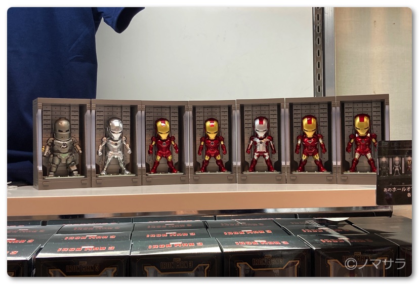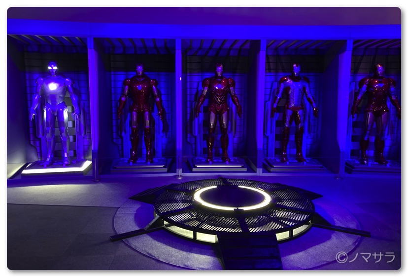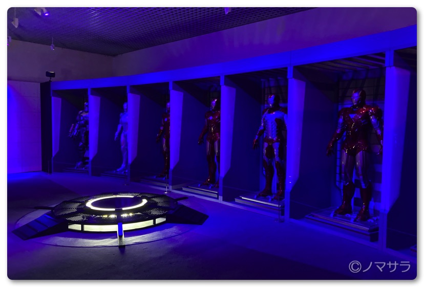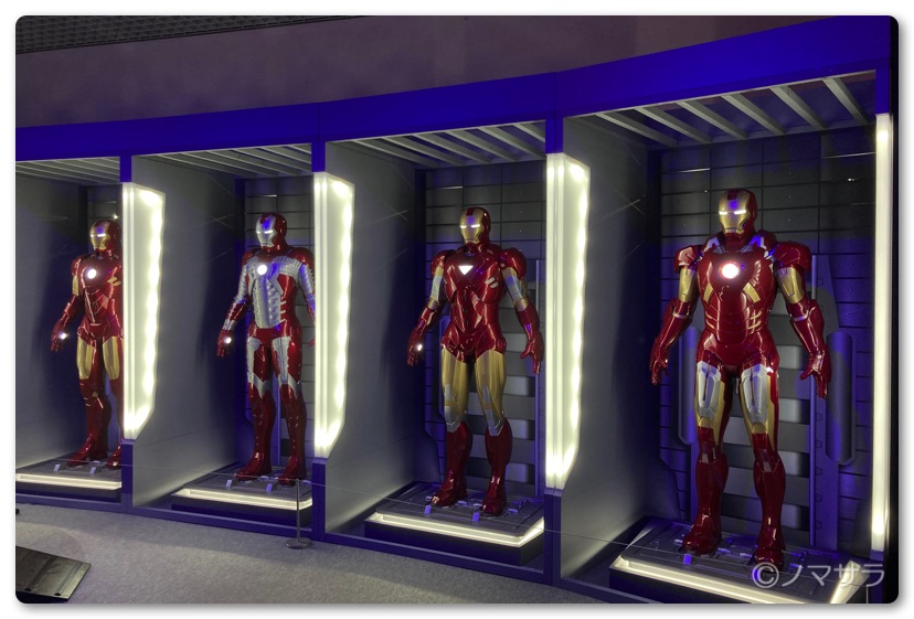 歴代のアイアンマンがずらっと並んでおり一定間隔でライトアップされます。実物大で見るとやはりカッコいい。これで本当に空を飛べたらめっちゃ楽しいだろうなぁ。