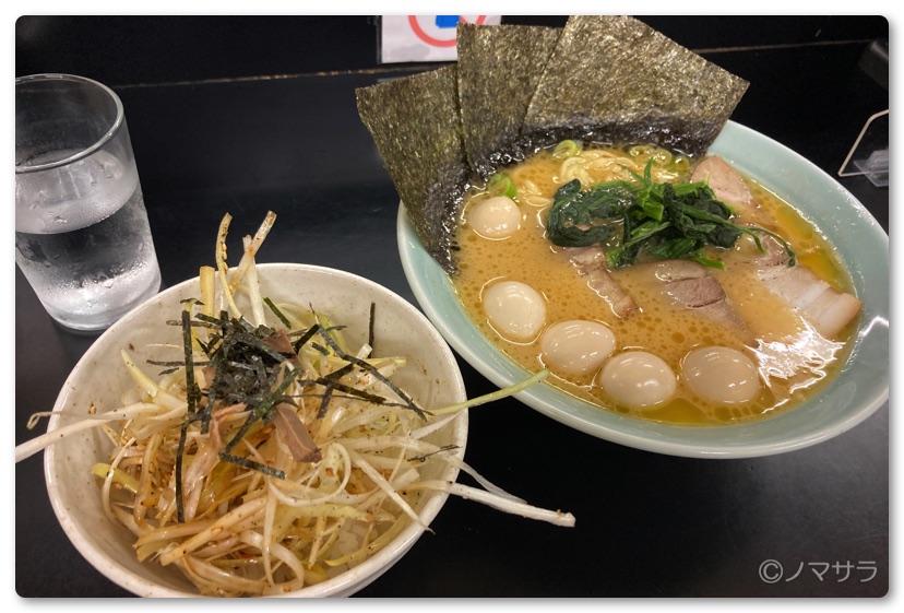 今回はチャーシューメンにうずらたまごトッピングとネギ丼(小)を注文しました。
