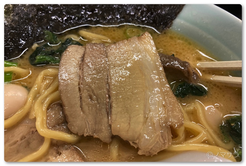 チャーシューは一般的なタイプ。最近は低温調理されたしっとり系のオシャレなチャーシューが増えていますが、ここは昔ながらのチャーシュー。