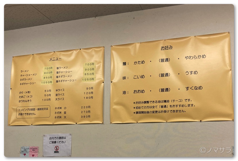 メニューはベースがオリジナル(とんこつ醤油ベース)と塩味の2種類、それぞれにチャーシューメン、ネギラーメン、ネギチャーシューがあり、麺の硬さ、味の濃さ、鶏油(チーユ)の量を選ぶことができます。トッピングはノリ、うずらたまご、ほうれんそうの3種類。オススメはうずらたまごで多くの方が注文しています。