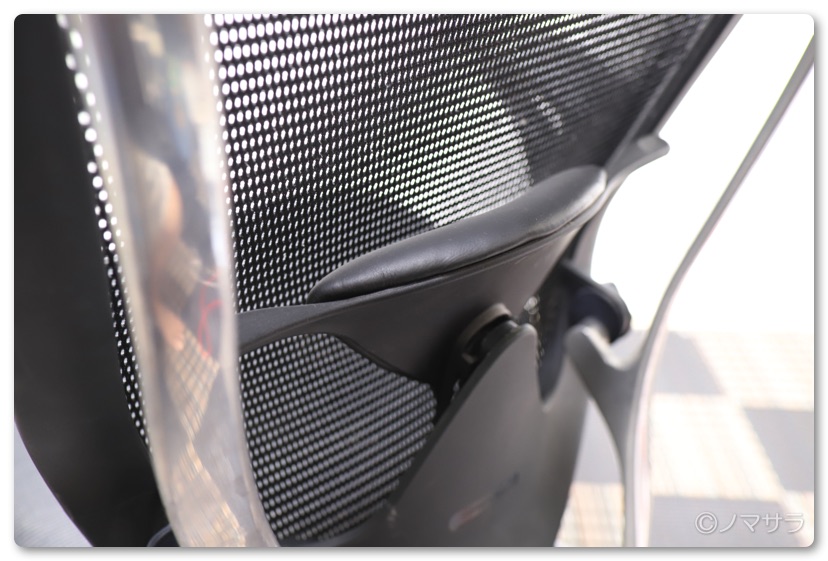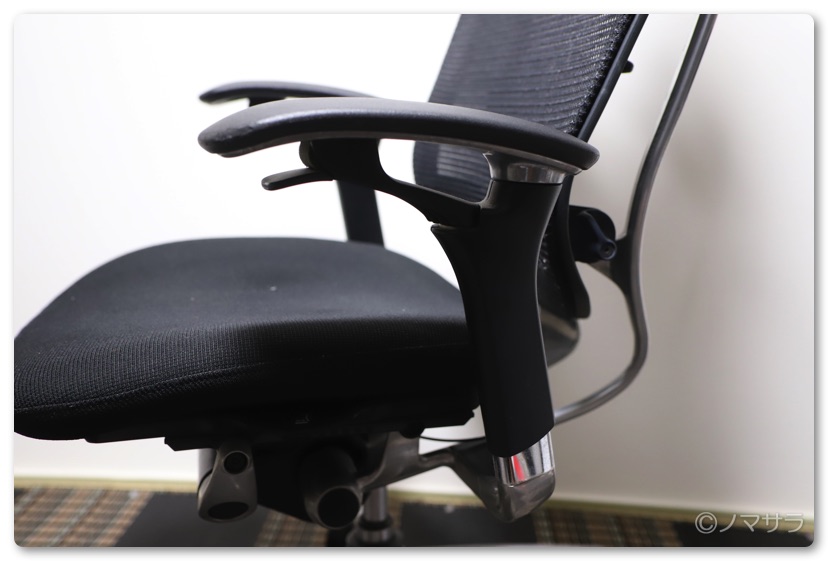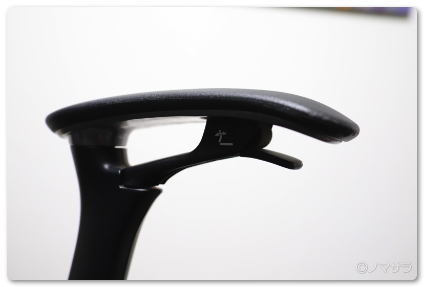 アームレストはラチェット式で、座ったままの姿勢で軽く持ち上げるだけで高さ調節(100mm)が可能です。