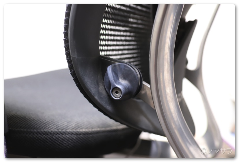 ロッキングの強弱を調整するダイヤル。体型やお好みに合わせて、リクライニングの固さを座ったままで調整できます。