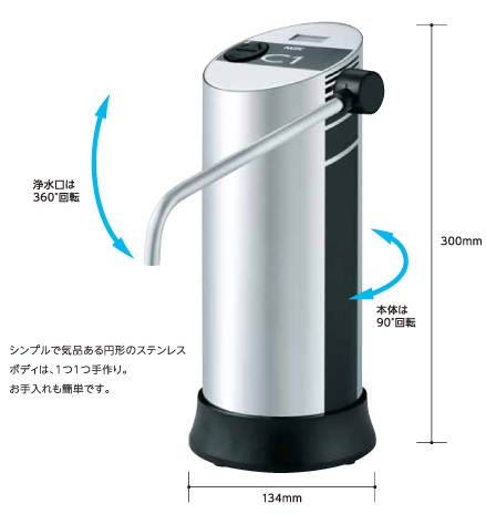 ファインセラミックフィルターと高性能活性炭、鉛除去セラミックスで、水道水をあんしんでおいしい水に。本体を回転させることもできるので、キッチンのさまざまな作業に対応できます。