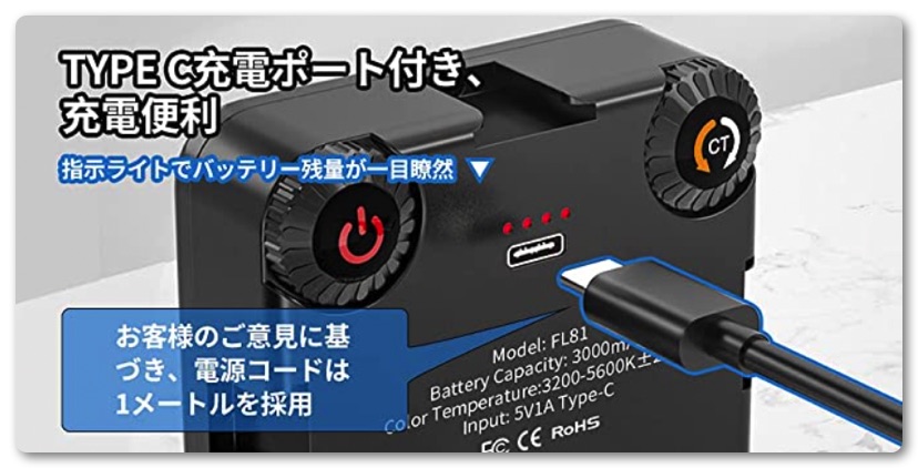 本体には大容量3000mAhのバッテリーを内蔵し、フル充電の場合は、輝度によりますが約2.5〜8時間の利用が可能。また、TYPE C充電ポートを搭載しており充電時間は約3時間、撮影時のバッテリー不足の心配はまずありません。長時間の場合は充電しながら使用することもできます。背面に残量表示ライトがあり、バッテリー残量は一目瞭然。