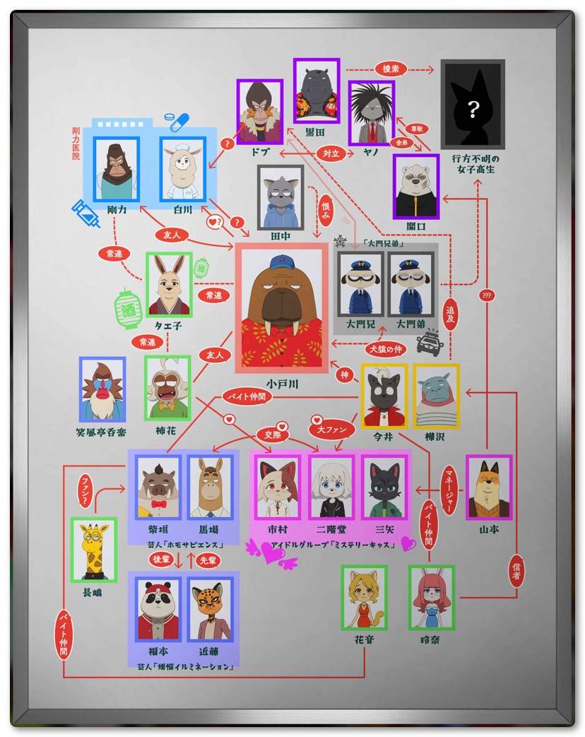先日AmazonPrimeVideoで発見したアニメ「オッドタクシー」。テレビ東京系列で深夜放映されていたアニメですが現在、AmazonPrimeVideoのみで配信されています。主人公のタクシー運転手小戸川をはじめ、それぞれセイウチ、カバ、ウマ、イヌ、サル、マントヒヒなど何かしら動物モチーフのキャラ設定になっています。
