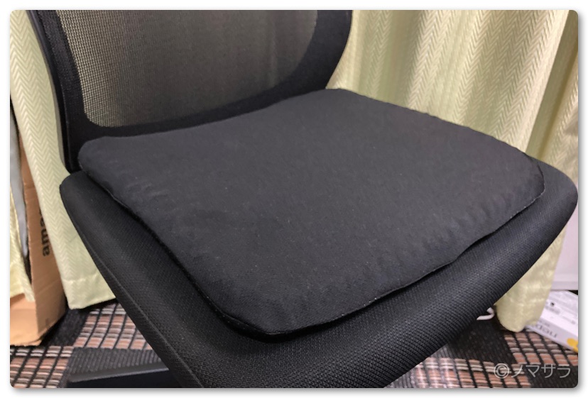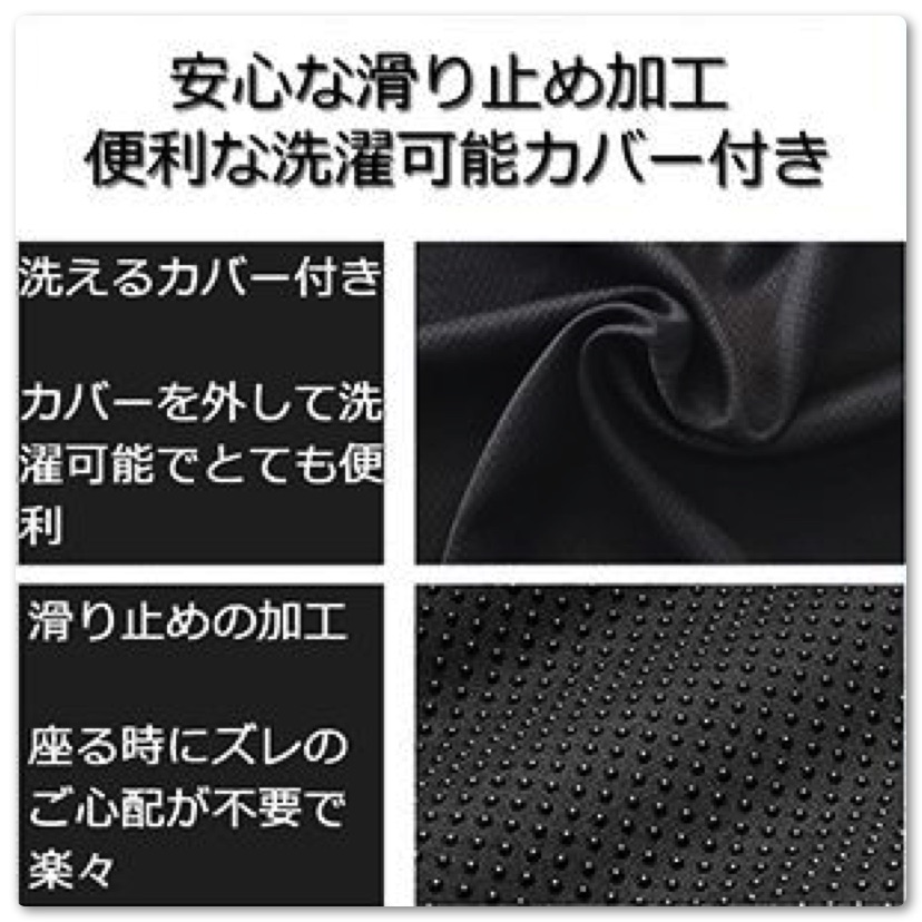 椅子の上でも滑らずに固定できるカバーが付属しています。汚れたら洗濯機で洗えますので、とても便利。